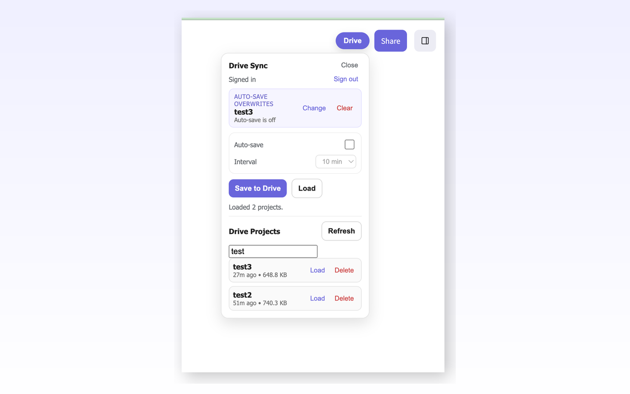 Open Excalidraw and you'll see a new Drive menu. Save drawings or enable auto-save.