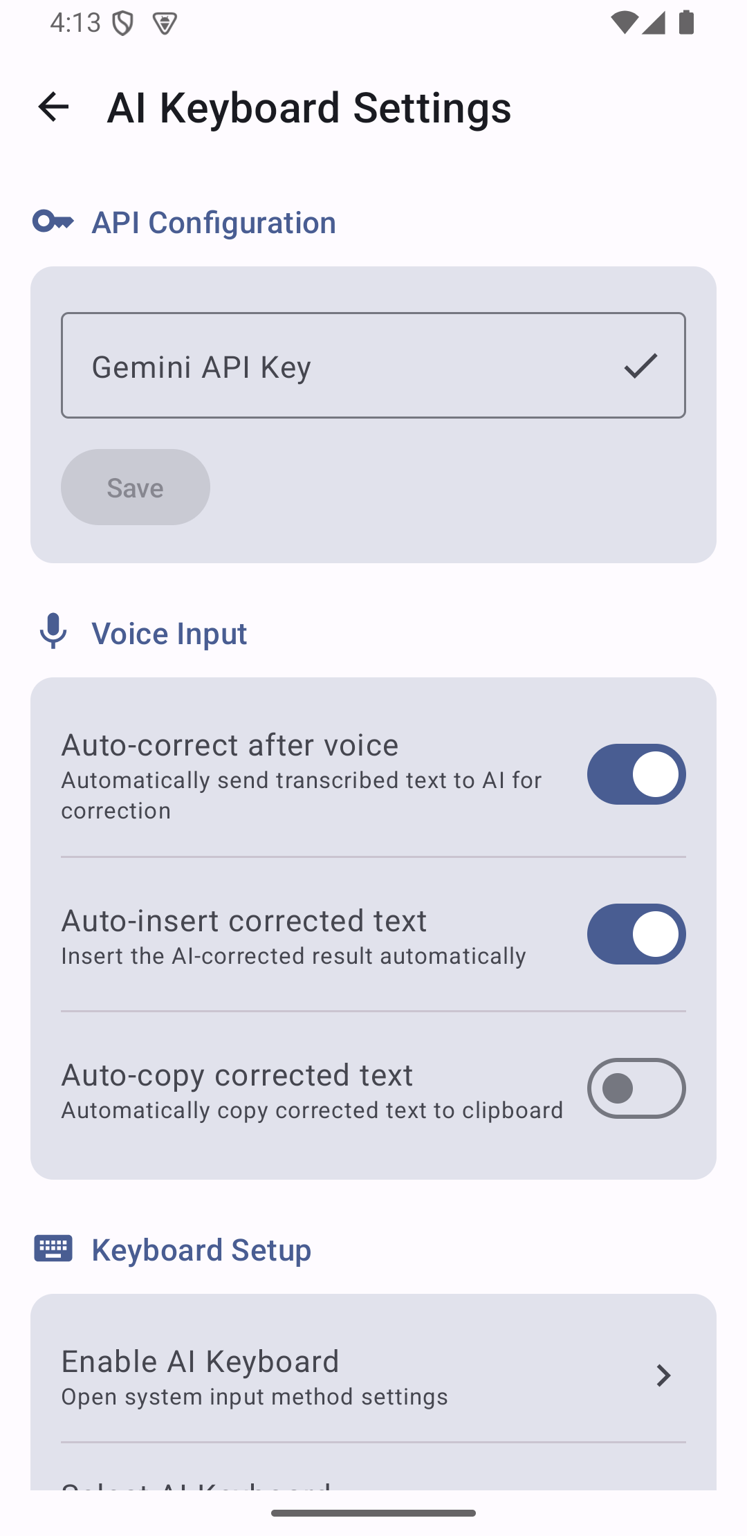 In Settings, you can add/clear your Gemini API key, toggle auto-correct after voice, and control whether corrected text is auto-inserted or auto-copied. Need help getting a key? Step-by-step guide.