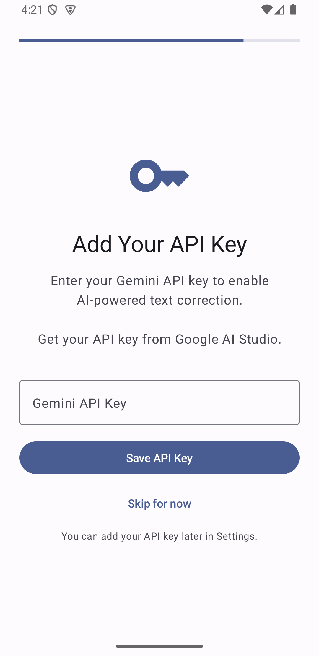 Add your Gemini API key to enable AI correction/rewriting. You can skip this and add it later in Settings. Need help getting a key? Step-by-step guide.