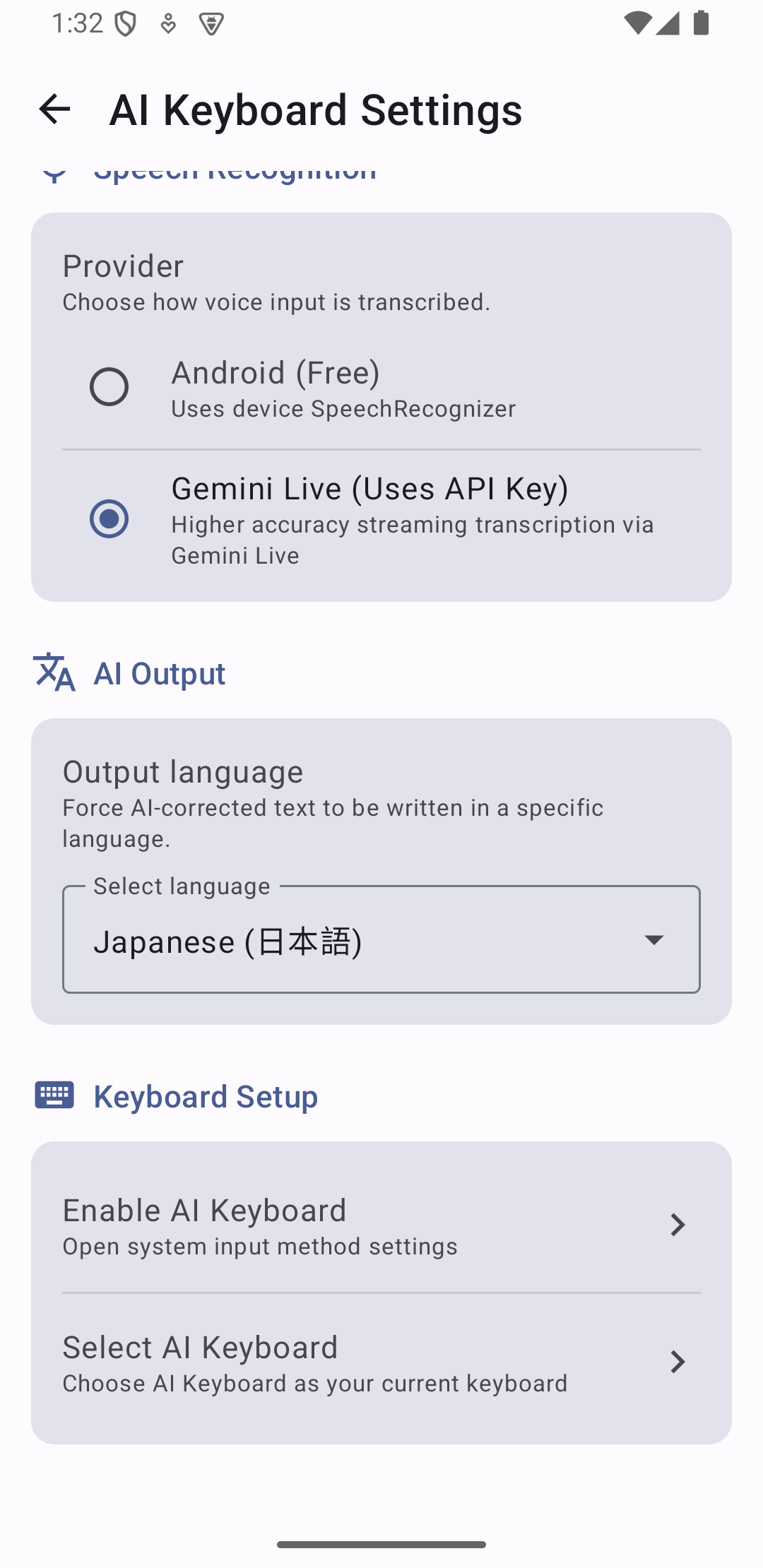 Choose your speech recognition provider: Android (Free) uses the device SpeechRecognizer (recommended if you don’t have a paid Gemini plan). Gemini Live provides streaming transcription, but on the free tier it may be unstable or quota-limited. Free keys are still great for output styles (Fix Grammar / Professional / Casual). For native audio pricing details, see Gemini API pricing. For a quick monthly estimate, see Cost estimator.
